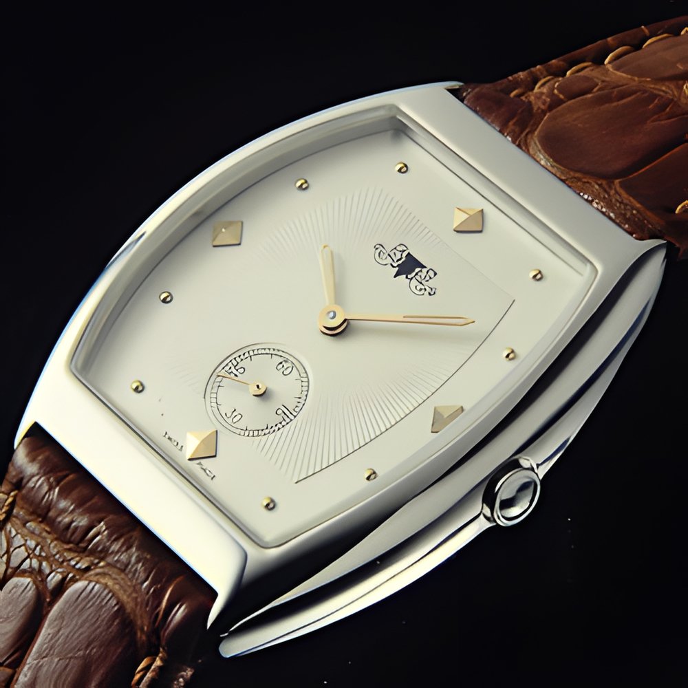 Only 1,000 of each of these softly rounded tonneau-shaped masculine watches will be made. Water-resistant to 30 m, their slightly cambered and tapered case is crafted in 800 silver and features one of three basic quartz movements : hours and minutes, hours, minutes and seconds subdial or else hours, minutes and night-and-day date calendar. Its ingot-type numbered case back is secured with screws. On the dial, jeweller Van der Bauwede’s medallion serves as signature. With «Louisiana» alligator strap.