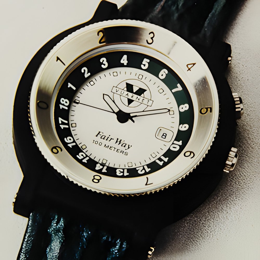 Derived from Vuarnet’s new «Sport & Action» product line, this design was developed specifically for golf enthusiasts. Stylishly sophisticated and totally reliable, the watch features a 10-position bidirectional steel base and an 18-hole centre dial to tot up golf scores. A quick glance at the dial tells its wearer exactly where he stands. Sporting a steel case water-resistant to 100 m, a white dial and a green leather strap, this quartz-driven design keeps very accurate time. With date calendar at 3 o’clock, mineral crystal and individually numbered steel back. Tritium-painted hour markers and hands.