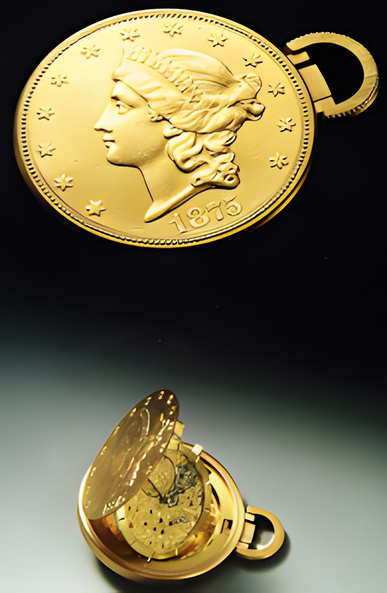 In innovative celebration of its 120th anniversary, Audemars Piguet is presenting a limited series of twenty 20-dollar coins minted in 1875. They contain the world’s thinnest hand-wound movement, a design that Audemars Piguet has been making for the last half-century. Crafted in 14K gold, it is entirely engraved by hand. The coin itself is fitted with a coverlid that opens to allow the watch to be raised on its hinge to display its dial on one side and its movement on the other, through a sapphire back.