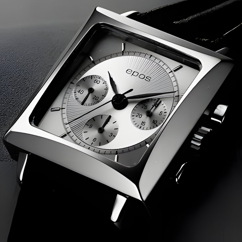 Strikingly original in styling, this square-cased chronograph features a very high quality Swiss mechanical movement providing the following lime-measurement functions : seconds totalizer at centre plus 30-minute and 12-hour totali7ers. Permanent seconds subdial at 9 o’clock The all-steel case’s frame features slightly concave surfaces and a transparent back reveals the movement’s tireless dance. Round, engin-turned dial with applied hour markers on a silvered ground.