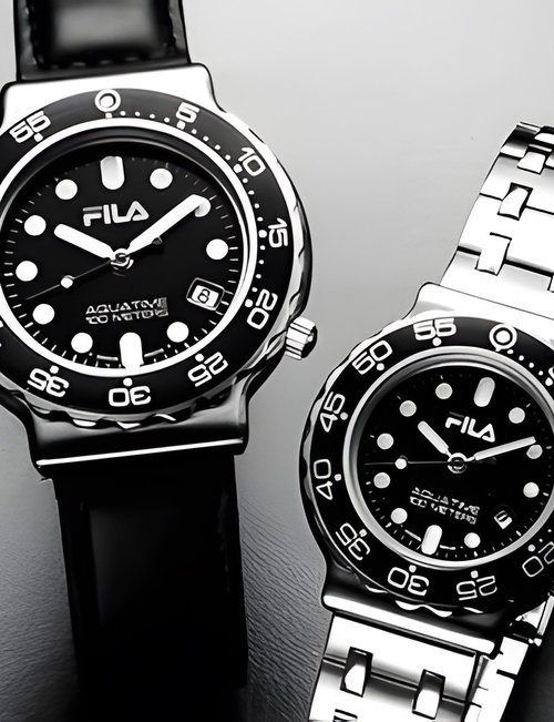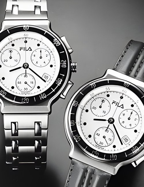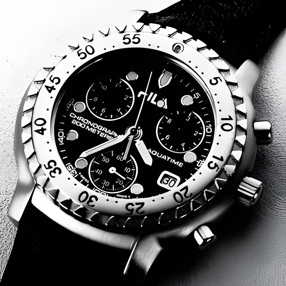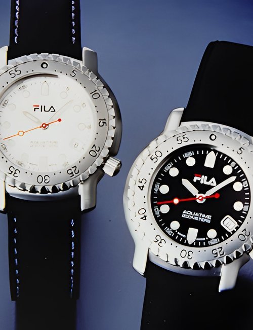 This diver’s chronograph rounds out the new « Fila Sportime » collection. It is equipped with an ETA Swiss Quartz movement with hours, minutes, seconds and 1/10th second calibrations plus a date calendar. Waterresistant to 200 m, its steel case features a sapphire crystal, a steel or goldplated crown and a screwed-in back. It is fitted with a steel or 10-micron goldplated unidirectional, ratcheted bezel with black hour figures and a tritium dot a 12 o’clock. Choice of black, night-blue or champagne dial with luminous hands and hour markers. Leather strap with steel clasp bearing the brand symbol.