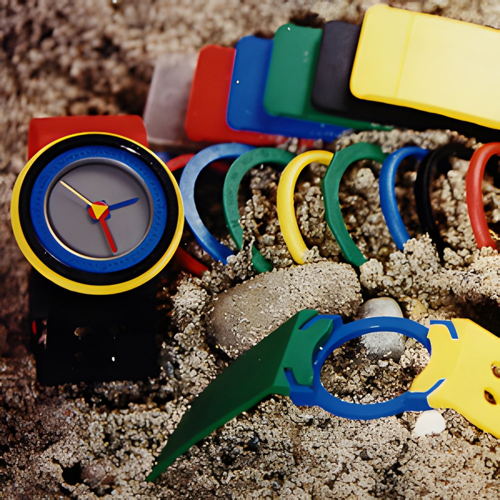 This Swiss-made quartz watch is a rugged water-resistant design fitted with a mineral crystal : shapes, colours and functions form a set assemblable and reassemblable in tens of thousands of possible variants by children of all ages into, say, a tachymeter, a twin-timezone design, a rotating timer and more.