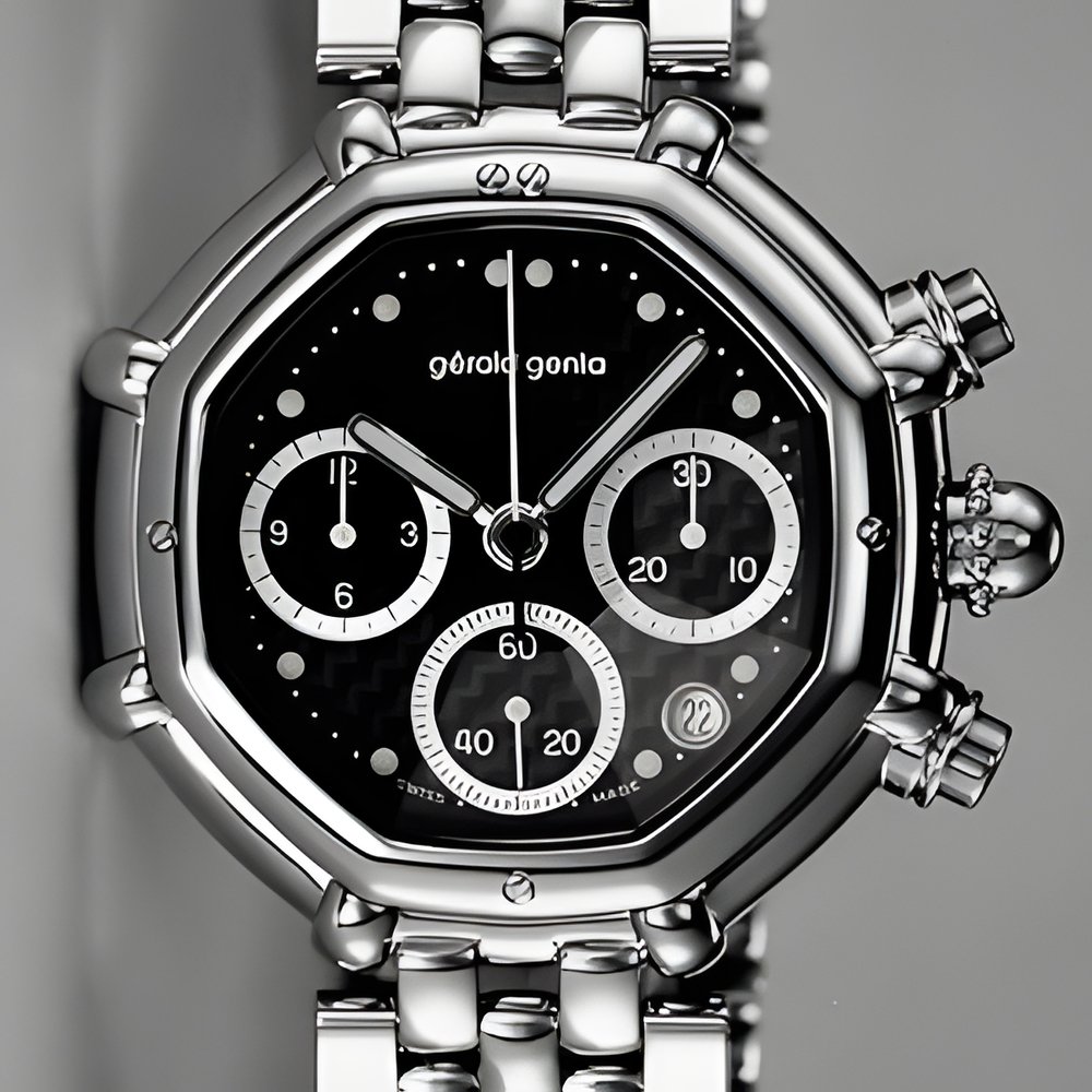 octagonal «signature» silhouette, internally facetted sapphire crystal «set» into the case. Its black fibreglass, steel or white dial handsomely matches the steel or gold case. Metal bracelet or leather strap with deployment buckle.