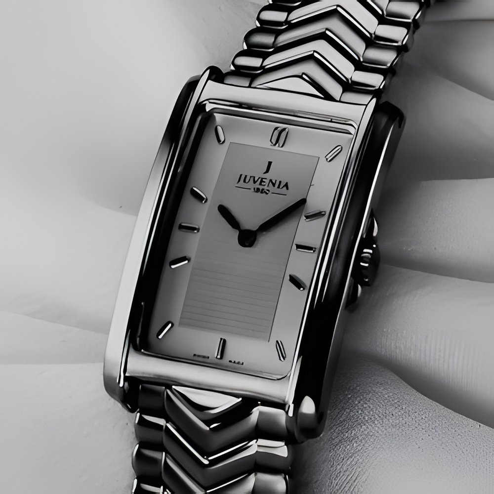 Pure geometric lines determine the styling of this new Juvenia design for men. Holding a quartz or a mechanical movement, its rectangular and slightly cambered case’s sleek, lean looks are enhanced by their smooth, satiny steel finish. A pair of polished ribs on either side of the bezel add a further note of elegance to an innovative timepiece fitted with a neatly integrated steel bracelet. Also available with a leather strap with tabs. A woman’s version is also planned.