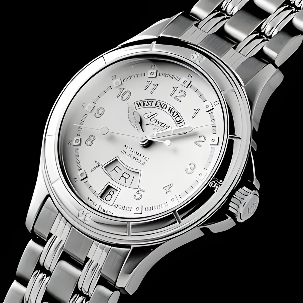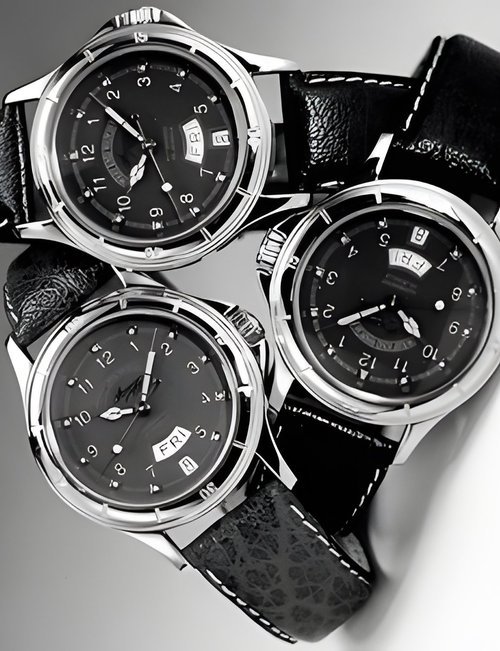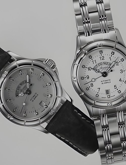 Particularly recommended for active, energetic people, this wristwatch combines stylishness and ruggedness. Fitted inside a stainless steel case with cambered crystal, screwed-in back and protected crown, its se1fsnding mechanical movement includes a day and date calendar. The goldplated bezel features engraved quarter-hour divisions while the steel bracelet is made up of three rows of satin-finished links and two of polished 18K goldplated godroons. Available in three styles : all steel, two-tone or entirely goldplated, with metal bracelet or coloured leather strap matching the dial.