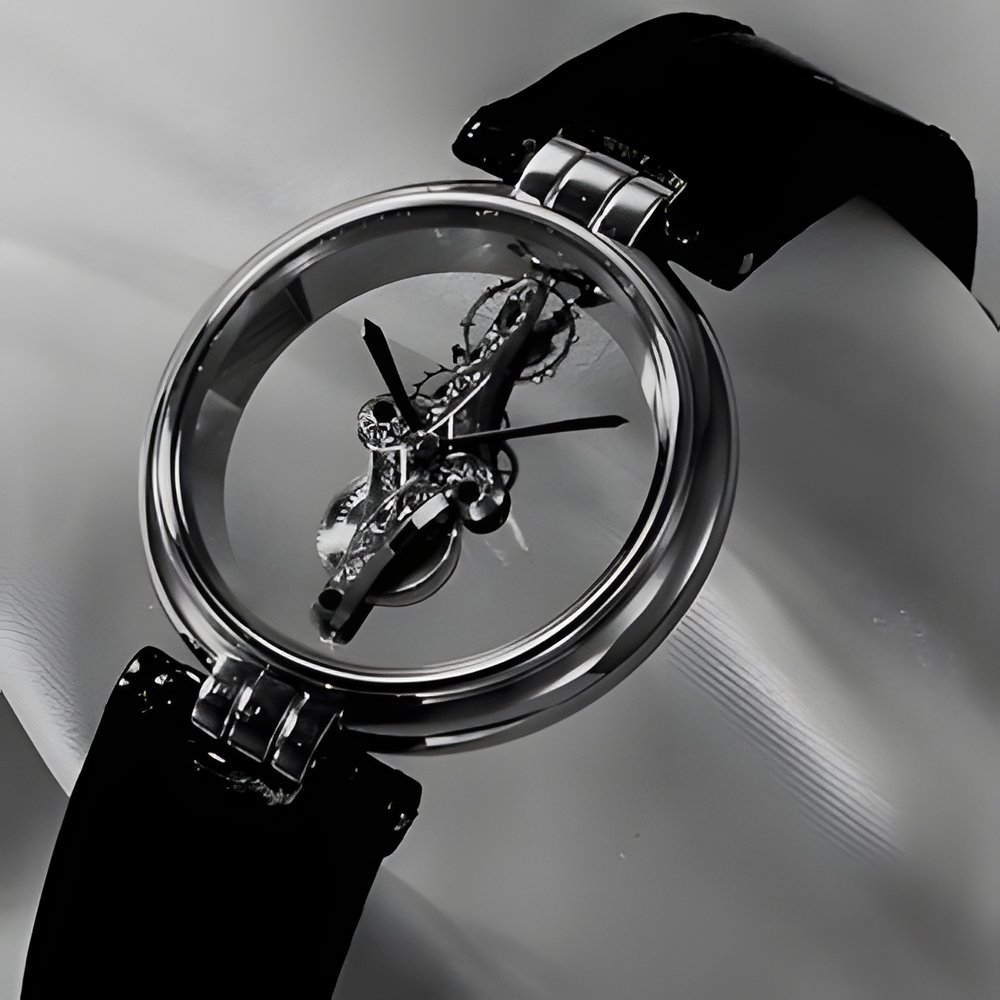 Heavy, dense metal but light and airy lines for this watch called «Esprit» (meaning both «spirit» and «wit»), a development of one of its maker’s earlier models. The solid platinum movement features two «arms» symbolizing technology and art respectively. Although the metal is extremely difficult to work and shape, even the case frame is crafted in platinum. A milestone in contemporary watchmaking, « Esprit Platine)> is a oneof-a-kind achievement dedicated to convinced watch buffs.