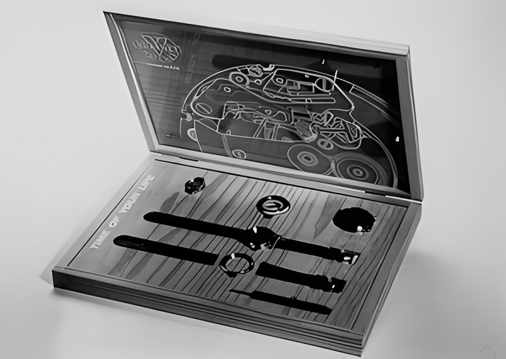 Designed for the adventurous at heart, this presentation case is crafted in larch wood. It contains a Vuarnet Cup wristwatch (with quartz movement, steel case water-resistant to 200 m and scratch-resistant sapphire crystal), a compact compass (water-resistant to 250 m, able to withstand temperatures from 3OO to 700), a ratcheted, unidirectional rotating bezel, an altimeter (measurement range : -300 to 4,500 m, UHR 4 501R movement), a spare strap in genuine sharkskin with strap-changing tool and a specially designed lapel pin. The crown is designed for clipping on each of the watch’s removable accessories while its time-setting functions are accessed by lifting the upper part of the watch.