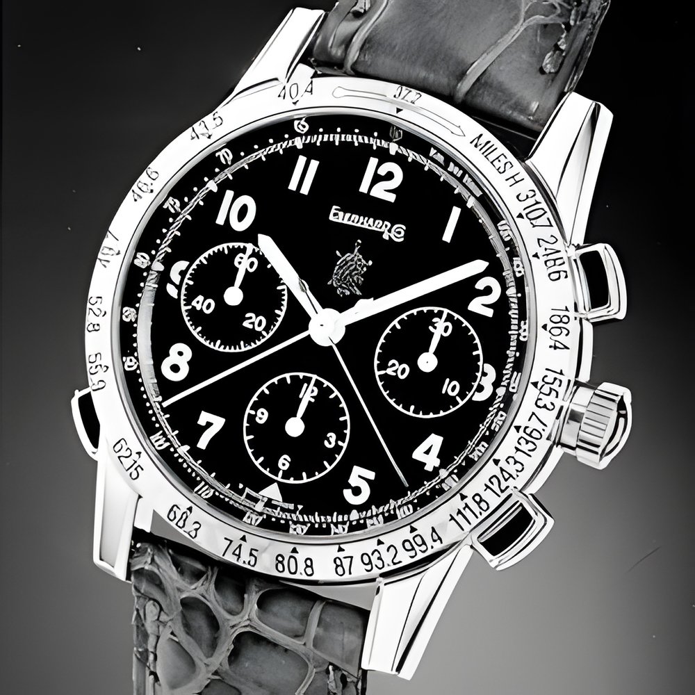 This unique chronograph is appreciated and sought after by collectors for the characteristics of the movement and the care given to details : the finish of the case-back, the engraving of the driver’s signature, the reproduction in relief on the dial of the great «Nivola’s» tortoise charm. Automatic chronograph movement with fly-back mechanism to read an intermediate time or a double timing. Case in steel with back fixed by 8 screws, antireflection convex sapphire glass. Pearled bezel with engraved tachymetric scale graduated in miles/hour. Black dial.