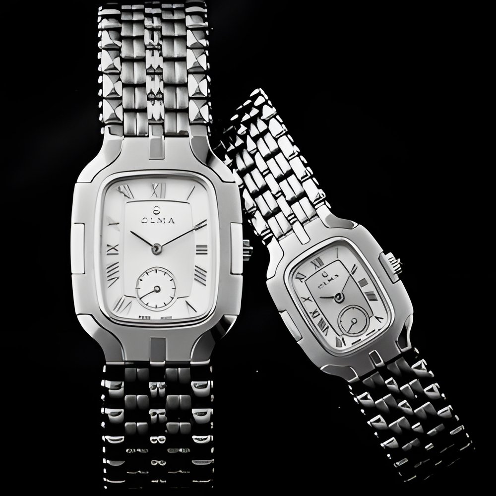 In answer to clear market demand, the Olma watch manufacturing company is once again renovating its product lines. These timepieces are equipped with a quartz movement featuring a seconds subdial at the centre of the dial. Their two-tone rectangular cases, water-resistant to 30 m, feature an exceptionally original bezel framing a mineral case that matches to perfection their integrated bracelet. Available in His & Hers sizes.