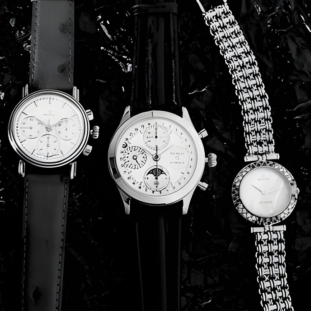 Three distinctive designs from the Repco company. From left, a woman’s mechanical chronograph with handwound movement and man’s seifwinding chronograph with moon-phase display. Both are fashioned in 18K gold and offer a choice of bracelet and strap styles and of dial colours. At right is an 18K gold jewellery watch. Fitted with a quartz movement, the case includes a sapphire crystal and its bezel carries 29 diamonds and 28 rubies. Also in solid gold, its bracelet is entirely hand-made. Dial in genuine mother-of-pearl.