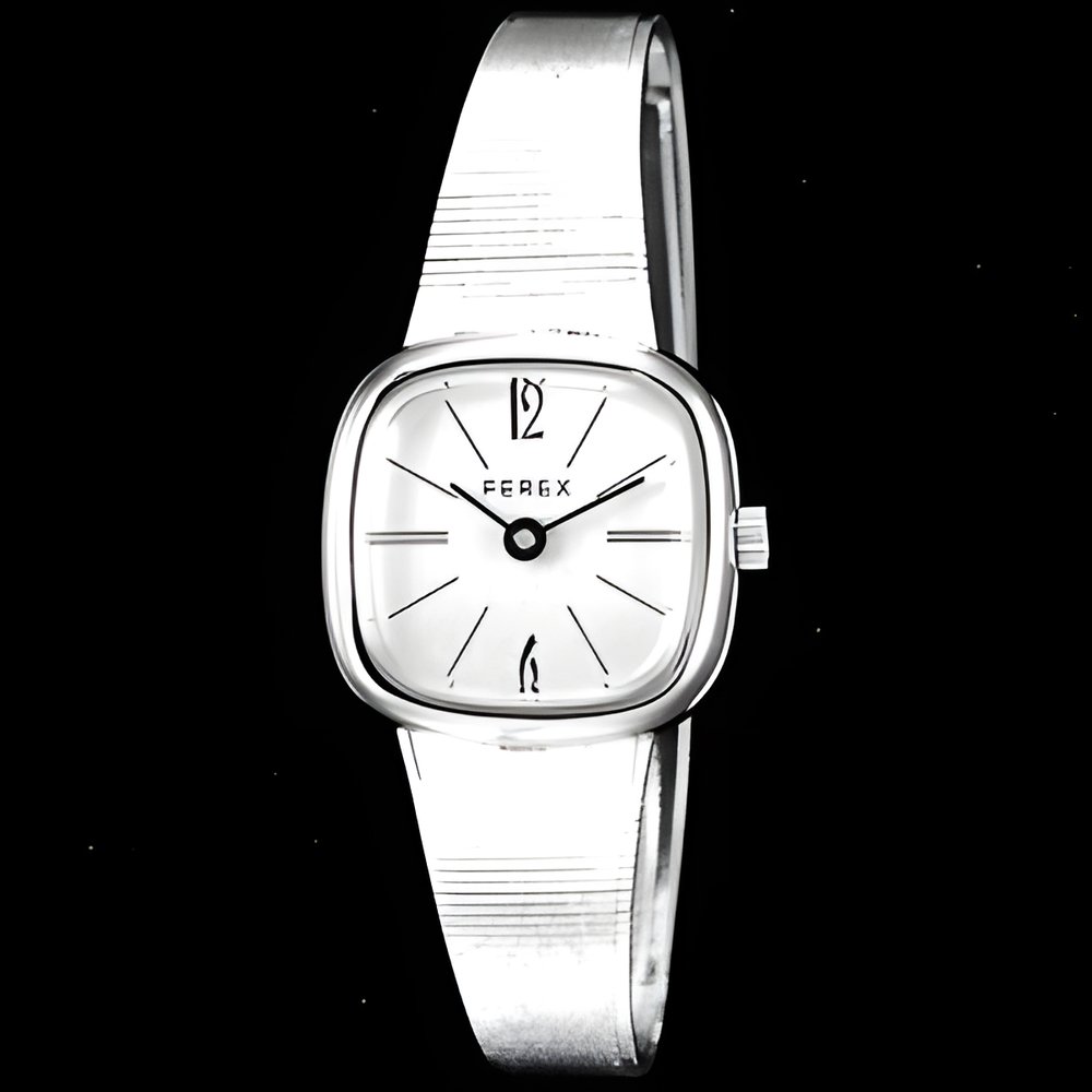 Broad gilt dial, slim bezel and integrated bracelet and case - a model that is very representative of current trendy styling. And very moderately priced too. (FEREX)
