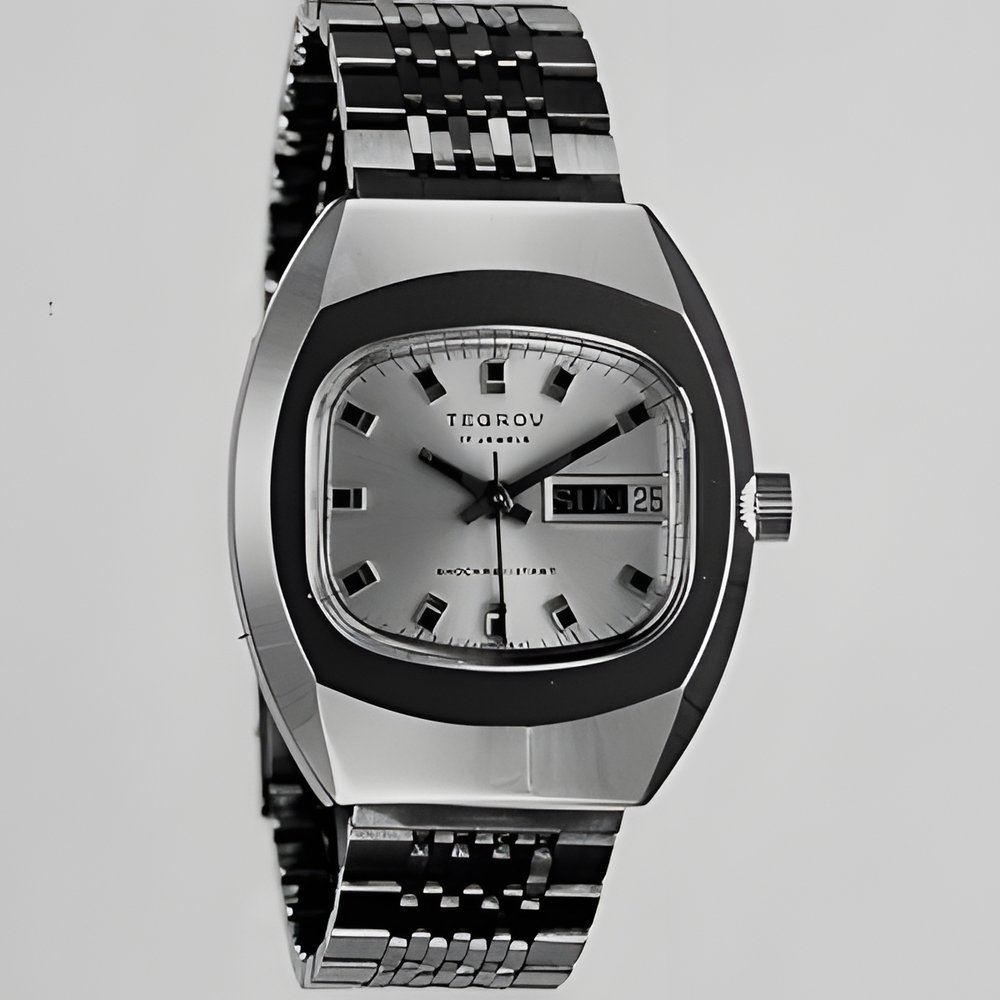 A very manly model with water-resistant case and integrated bracelet. Day and date calendar, centre second hand and shock-protection system. All this for a very reasonable price indeed (SCHAUB-TEGROV)