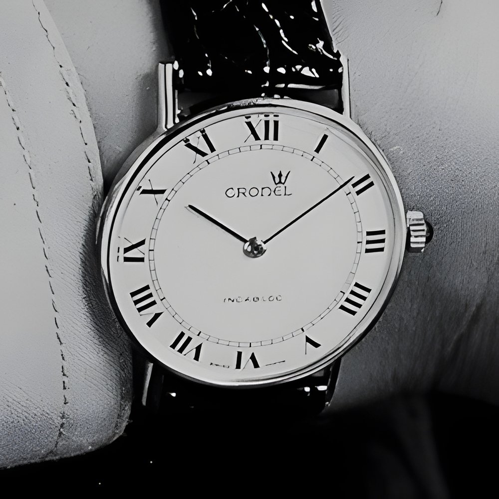 “Extra thin” and “ultra chic” best describe this economical model. Case with chrome or 10-micron goidpiate finish. Enamel-like dial with large Roman numerals, crown set with a cabochon. (CRONEL)