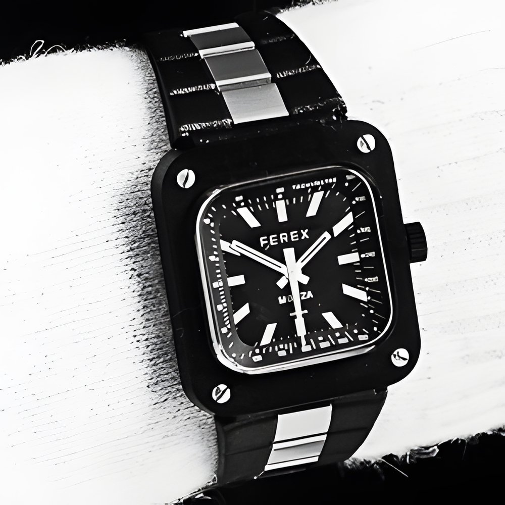 Racing car-inspired styling. Black synthetic case with “screwed-in” bezel, large black dial with very legible markers, tachymeter graduation. Matching bracelet. (FEREX - Monza)