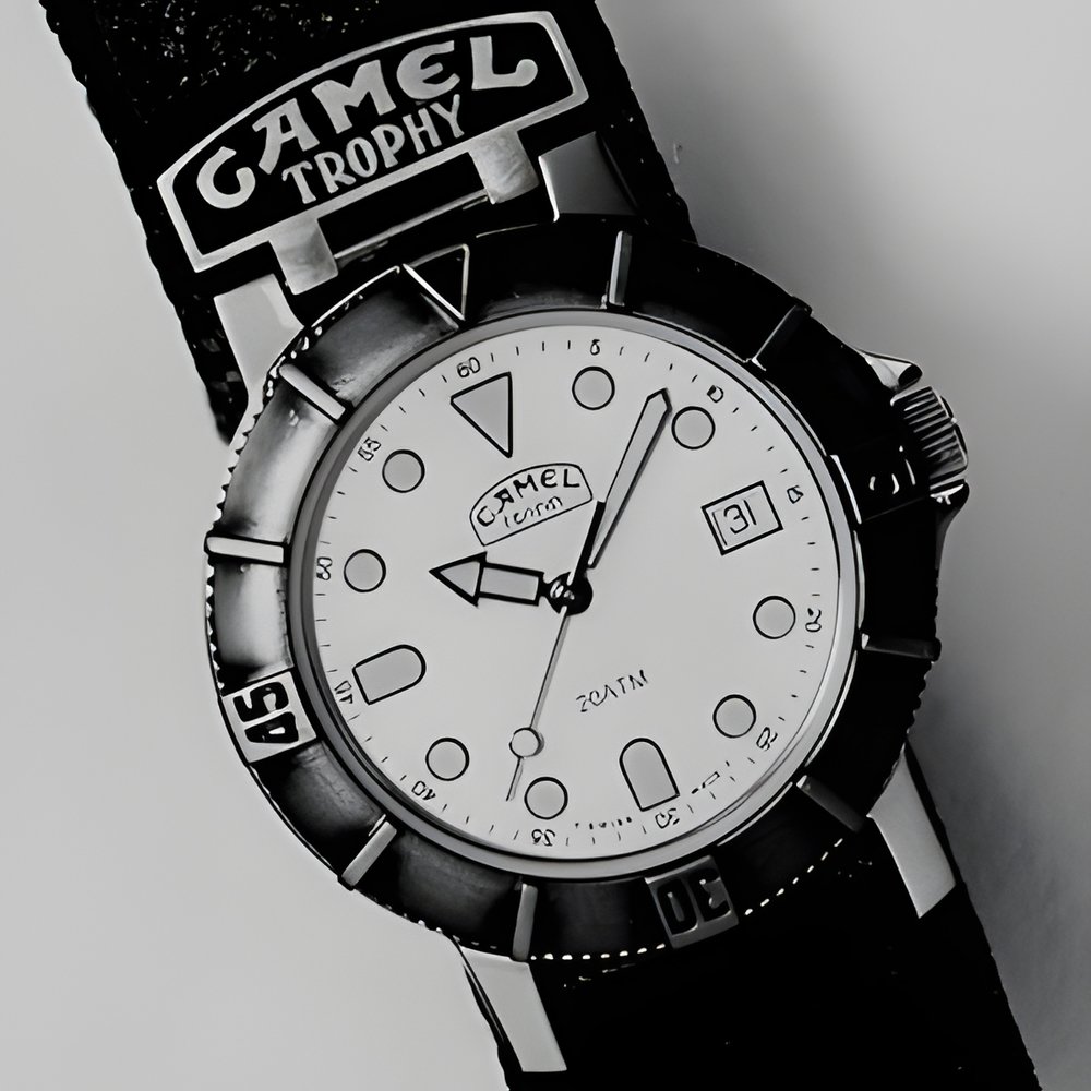 The «Equator» model from the Camel Trophy collection comes equipped with a particularly innovative velcro strap. Adjustable to any length, the watch can also be worn over bulky clothing. Its novel steel case features a screw-lock crown and an ultra-resistant mineral crystal, guaranteeing water-resistance to 200 m. It will be available from April 1996 with a choice of different coloured straps and bezels.