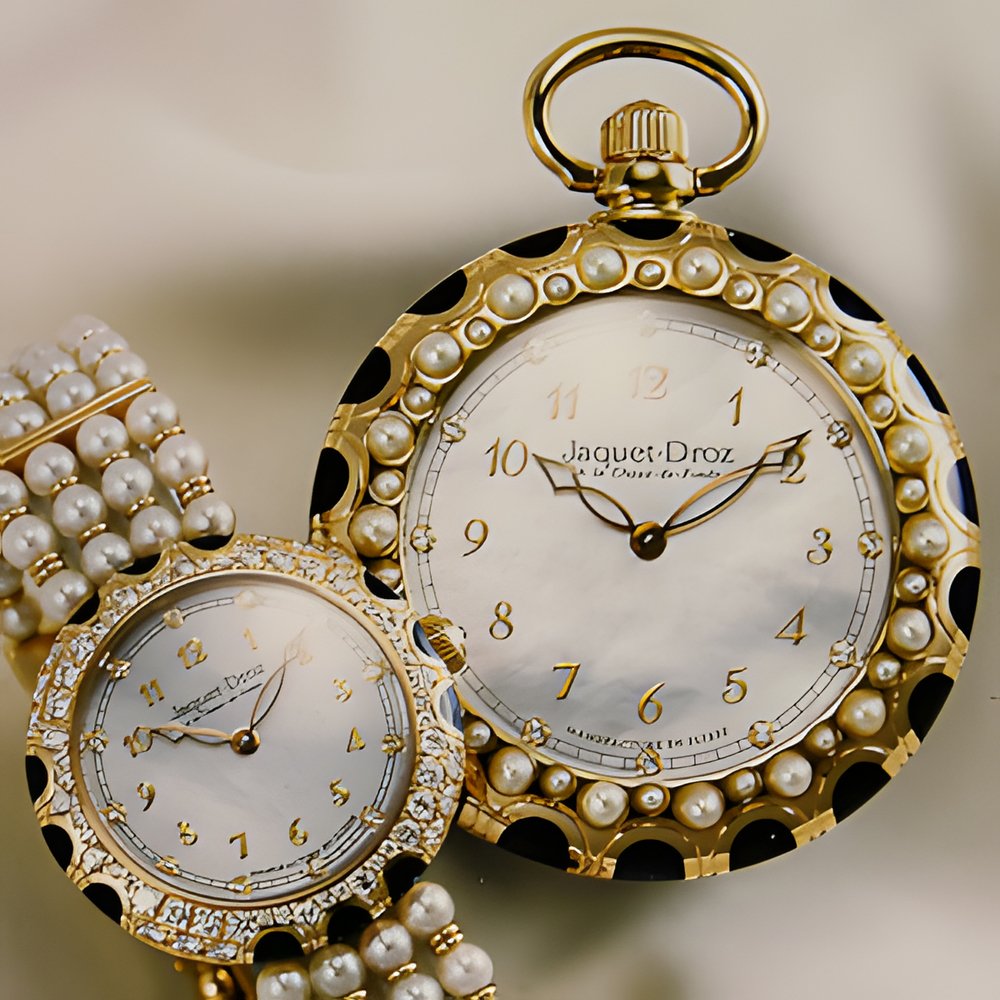 Exceptional jewellery pieces, these two watches are fashioned in 18K pink gold and come with a hand-wound mechanical movement. The wristwatch is decorated with 12 blue enamel cells, while its bezel is set with 60 diamonds (0.80 Ct). Embellished with 136 pink Akoya cultured pearls, the bracelet is punctuated with rings and barrettes in pink gold. The pocket watch has 18 blue enamel cells and 36 fine half-pearls on the bezel. Both mother-of-pearl dials are set with 12 diamond hour markers.
