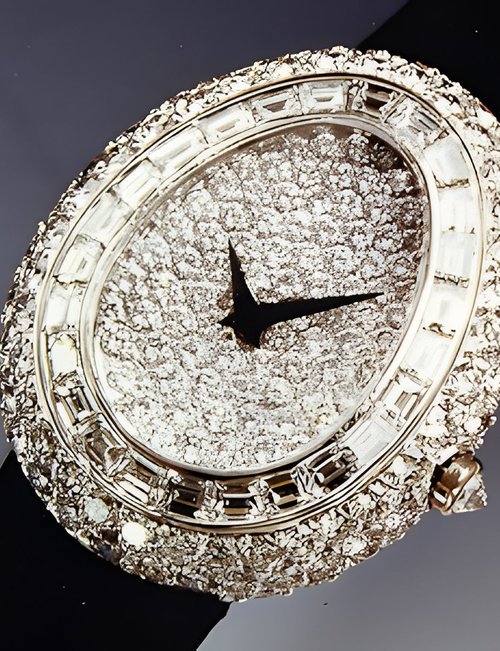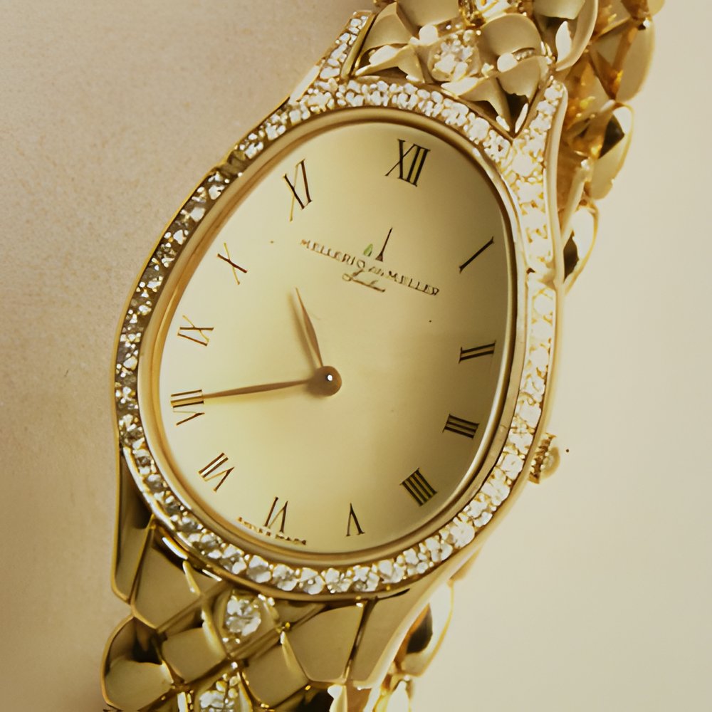 The unique shape of this model is neither round nor oval. The hand-polished 18K yellow gold case, water-resistant to 30m, features a bezel set with 58 brilliants (2.14 Ct) and a champagne-coloured dial with Roman numerals. The company’s «M» symbol is incorporated into the extended horns. Set with 22 to 26 diamonds (2.29 to 2.88 Ct), the 18K gold bracelet complements this jewellery watch’s classic and timeless lines. It is available in many versions.