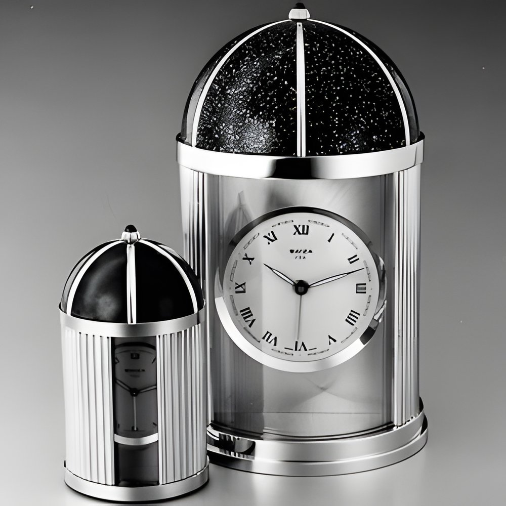 The charm of these new clocks lies in their gleaming lapis lazuli or red umber lacquered domes and in the originality of the sliding doors which can cover the dials. They are available in two sizes (141 x ø 83 mm and 79 x ø 45 mm) and in different versions: all gilt or silvered, or gilt with a lacquered dome. They have been fashioned from a block of solid brass, hand-polished and fitted with a quartz movement with an alarm mechanism.
