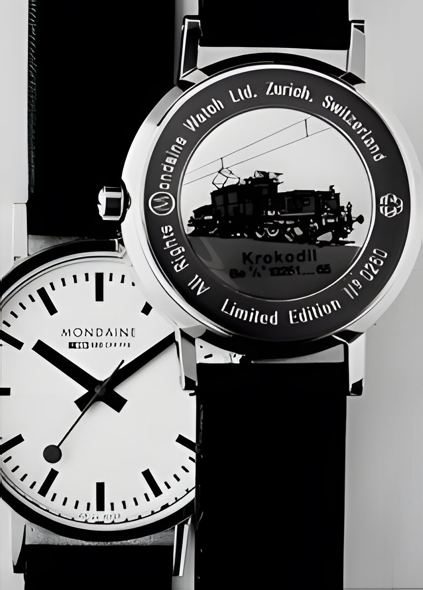 Who could forget the legendary «Crocodile» locomotives that were used to open the Gotthard electric line in the twenties ? To commemorate this event, Mondaine is launching a special limited series of its official Swiss Railway Station watch. Fitted with a quartz movement, the individually numbered case is made of 100% recycled metal. The caseback features a coloured reproduction of the locomotive that played such an important role in the history of Swiss transportation.