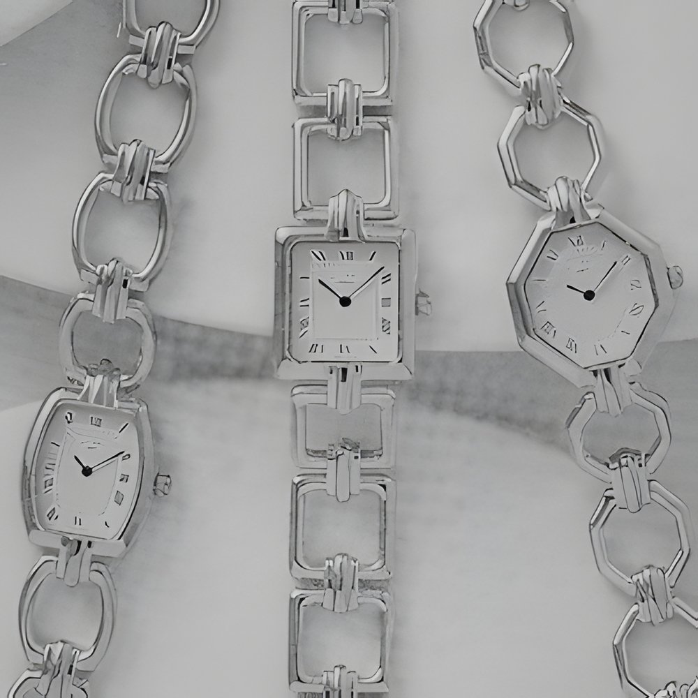 Rich forms and supple bracelets characterize these three classic ladies’ watches. Housing a quartz movement, the cases have ivory-coloured dials with black enamelled Roman numerals and feature slender central attachments.