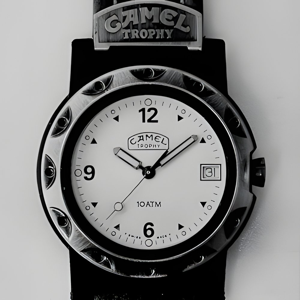 Attractively priced, this latest Camel Trophy Adventure Watch entry displays entirely a novel styling that expresses to perfection the brand’s specific character. Its black synthetic case is reinforced with «keviar», water-resistant to loo m and very robust. Its quartz movement features a date calendar at 3 o’clock and a center second hand. The rubber strap’s decorative pattern is repeated on the bezel. To enhance the attractivness of this very special watch it is also being offered on leather straps in various stylish colours.