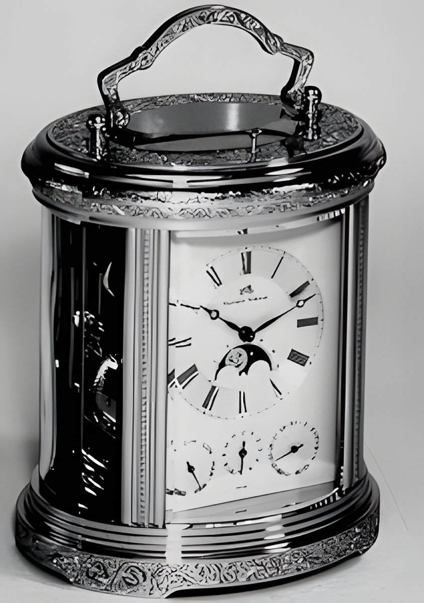 The pride of Matthew Norman’s al" collection, this prestigious hand-engraved clock’s solid brass case holds an 8-day movement with strike, repeater and alarm mechanisms. Its dial features both a calendar and a moon-phase indicator.