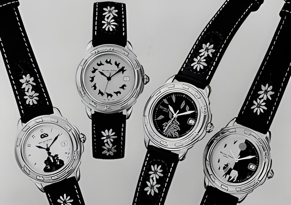 Called «Cuvée 94 ", Michel Jordi’s latest designs are premiering at Basel 94. This new line includes four distinctive and unabashedly colourful models best described as assertively Swiss in style and spirit. They feature an ETA Swiss Quartz movement inside a goldplated case that is water-resistant to 30 m, fitted with a mineral crystal and available in three sizes. Its fine leather strap features, yes, genuine traditional St. Gallen embroidery...