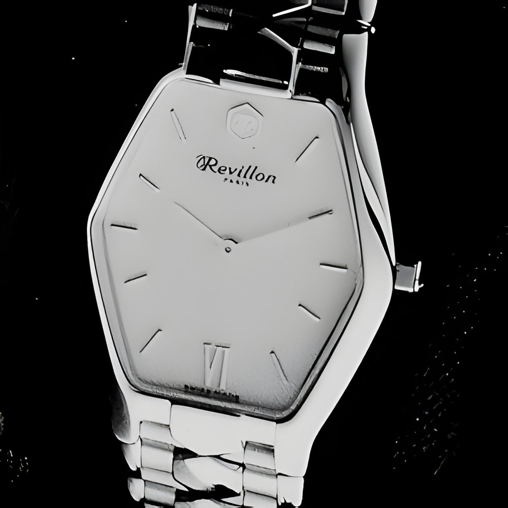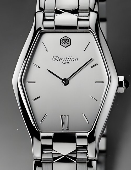 Reputed worldwide for its sumptuous furs, Revillon is unveiling a line of strictly feminine wristwatches this year, all with superbly timeless styling. Available in a choice of models, «La Royale» is made in 18K gold and is enhanced with a black or blue alligator strap, a blue dial set with three diamond markers or white with a mother-of-pearl centre. The «Princesse» line pictured here in yellow PVD plate with matching polished bracelet featuring brush-finished intermediate links and a folding buckle; the same model is also available in steel. These designs can be fitted with a grey, black, blue or wine-red genuine iguana strap. Water-resistant to 30 m, their case contains a Swiss quartz movement. Choice of white, champagne, grey, blue or wine-red dial. Onyx cabochon tipped crown.