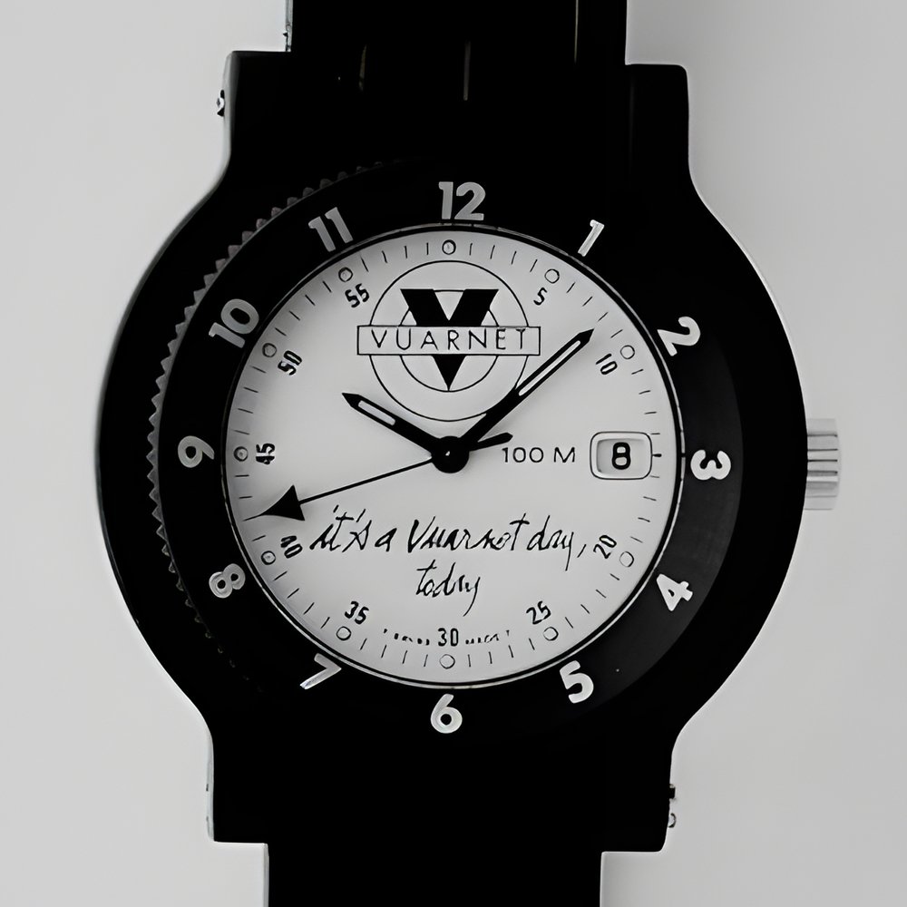 The «Vuarnet Day» design’s youth-oriented looks feature a case water-resistant to 100 m that is made of a dark grey, fibreglass-reinforced synthetic material over a stainless steel core. It contains an ETA Swiss Quartz analogue movement with date calendar. The dial’s hour markers and hands are tritium painted. Available in ten attractive hues, the flexible synthetic (arnitel) strap features the words «It’s a Vuarnet day today», also inscribed on the veneered dial face.