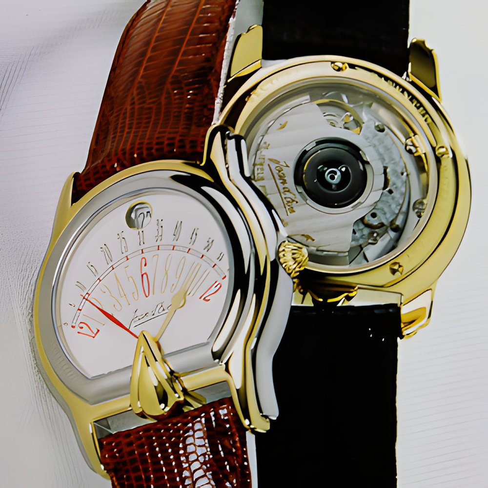 The “Sectora Automatique” design signals a new way of reading the time on the wrist. This design’s impressive high-frequency mechanical movement (288OO v.p.h.) is designed to display the time in a 120degree horizontal sector. Developed by Jean d’Eve, this amazing movement returns the hands to zero after 12 hours and 60 minutes respectively. Water-resistant to 30 m, the watch case with see-through back features a scratch-resistant sapphire crystal and the bracelet boasts a deployment buckle. The design is also available with leather strap and with a steel, two-tone or goidpiated case.
