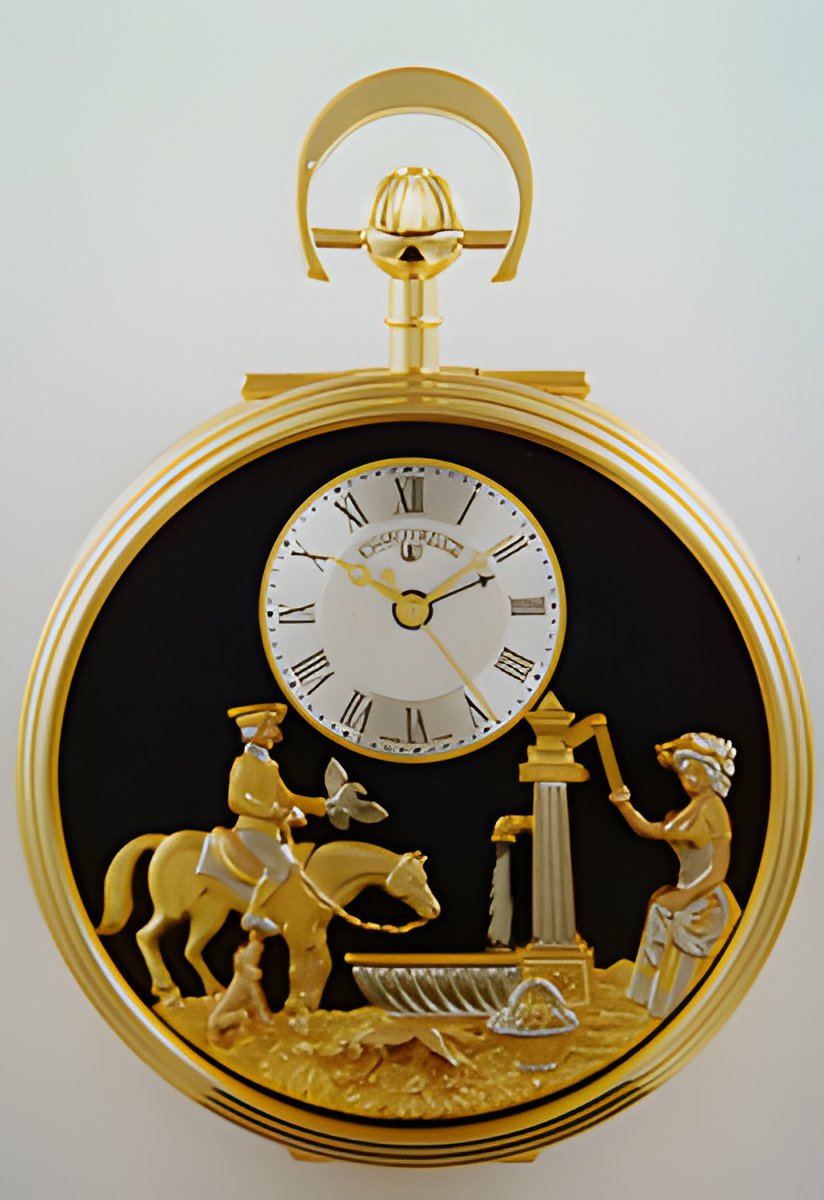 Romance, alarm pocket watch with music arid 2 automata 17-note, i tune musical movement. Silver plated, engine-turned case, golden Breguet levers. Front-side automaton «The Fountain» with blue enamel background. Design in gold : rose, yellow and grey coloured. Back-side automaton «Love» with golden designs, partly rose, yellow and grey coloured.
