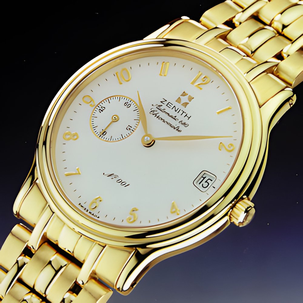 Made in, a limited edition only, numbered 1 to 250, by the Zenith watch manufacturing company, this chronometer provides a further demonstration of the ordinate precision and quality of Zenith timepieces. Its “Série 6” selfwinding movement provides the hours, minutes, seconds and date. Water-resistant to 30m, the case is solid 18K gold, as are the crown, the hour markers on the dial and the watch hands. With sapphire crystal.