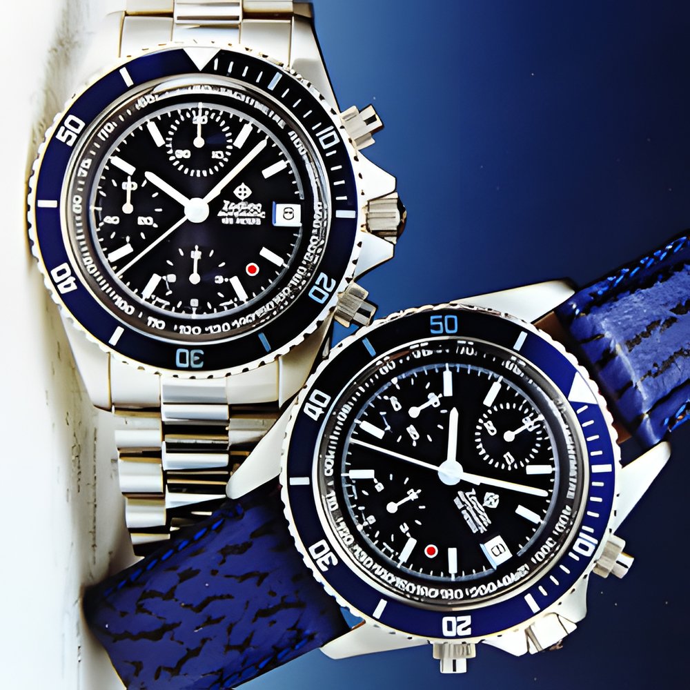 Zodiac’s «Red Point» design is water-resistant to 100 m and comes equipped with a selfwinding chronograph movement. Its dial with luminous markers features a date calendar along with a seconds, a 30-minute and 12hour totalizer, and its flange is inscribed with a tachymetric scale. Its unidirectional rotating bezel bears a blue anodized aluminium ring with 0-60 minute graduations and a tritium dot. Available with blue sharkskin strap or stainless steel bracelet with safety clasp and extension piece.