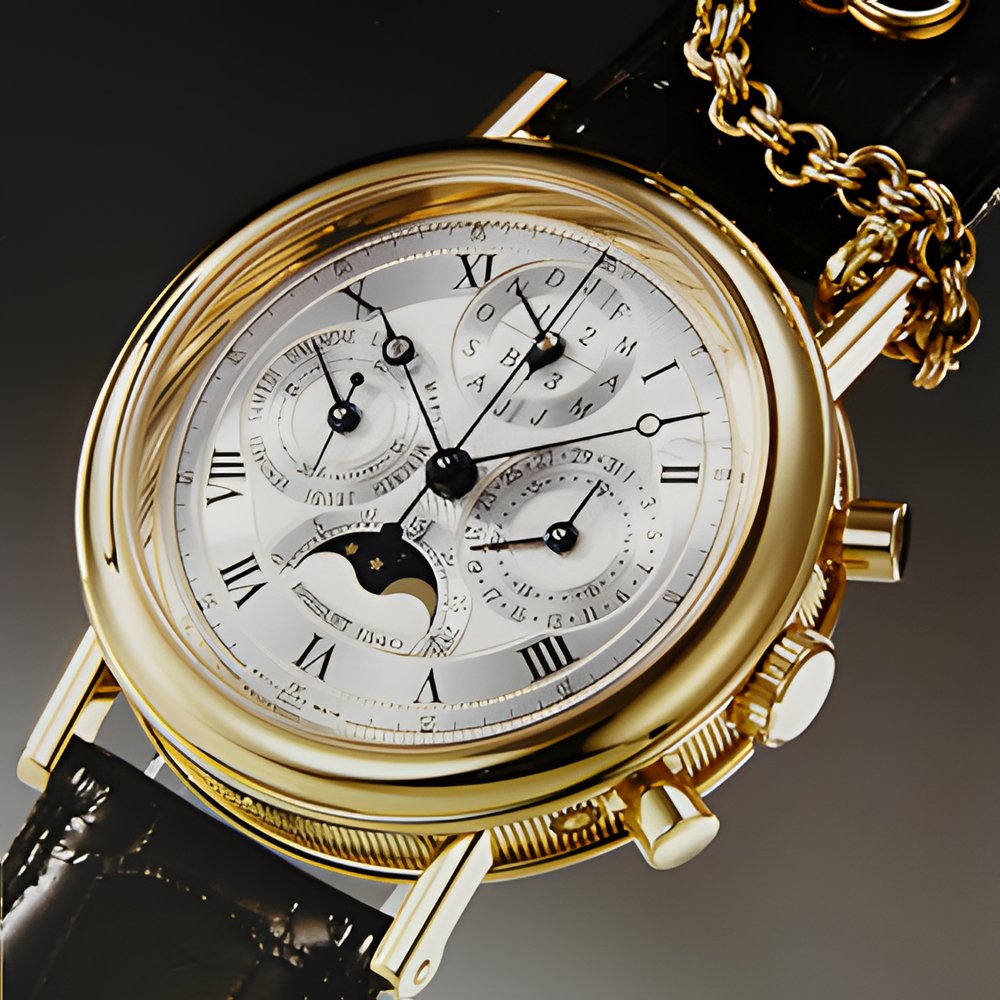 This perpetual-calendar chronograph for men shows the phases and age of the moon and remembers leap years. Along with an 18K yellow gold case with see-through back, it features a silvered gold dial entirely engine-turned by hand and individually numbered. Blued steel hands. Its 12-line, 21-jewel straight-line lever escapement features a screw-fitted balance wheel and a Breguet overcoil spring.