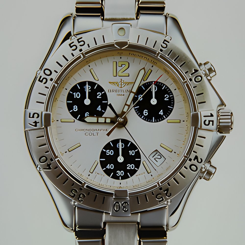 Notably thinner and smaller in diameter than its other models, Breitling’s «Chrono Colt» possesses an exceptionally compact case water-resistant to 100 m thanks to a crown and stem fitted with twin gaskets and a screwed-in back. Derived from the original Colt design, it offers exceptional sturdiness, compact dimensions and instant legibility. Fitted with Breitling’s calibre 53 quartz electronic movement, a «Chrono Colt» will measure time to 1/10th of a second and record it on its 60-minute and 12-hour totalizers. A split-second function actioned by the lower pushpiece can record and show split times. Its fast-action hour and date adjustment system facilitates timezone changes without altering the movement’s to-the-second precision. Its new, patented rotating bezel features fastening screws. Breitling’s new design is available in polished steel with meticulously satin-finished bezel framing a black, a blue or a silver dial. Leather, rubber or sharkskin strap or Professional steel bracelet.
