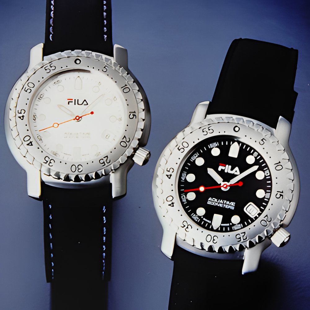 This calendar-equipped “Fila F46” diver’s watch offering a choice of black, silvered, gray and night-