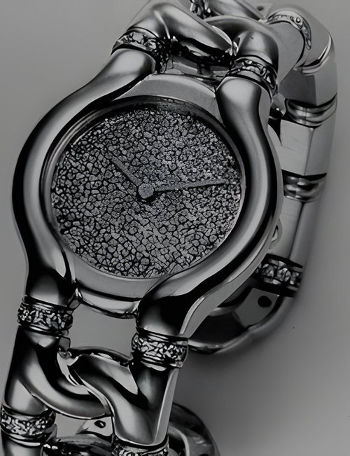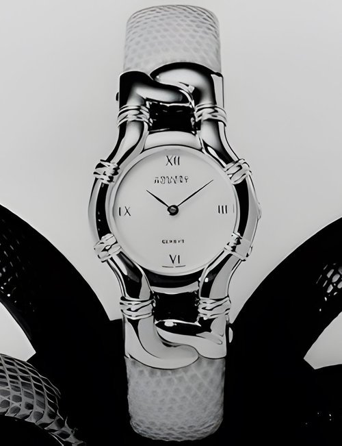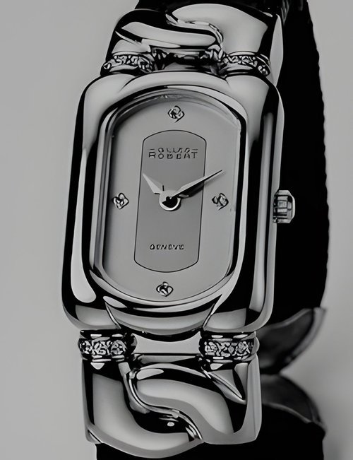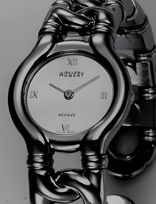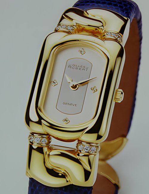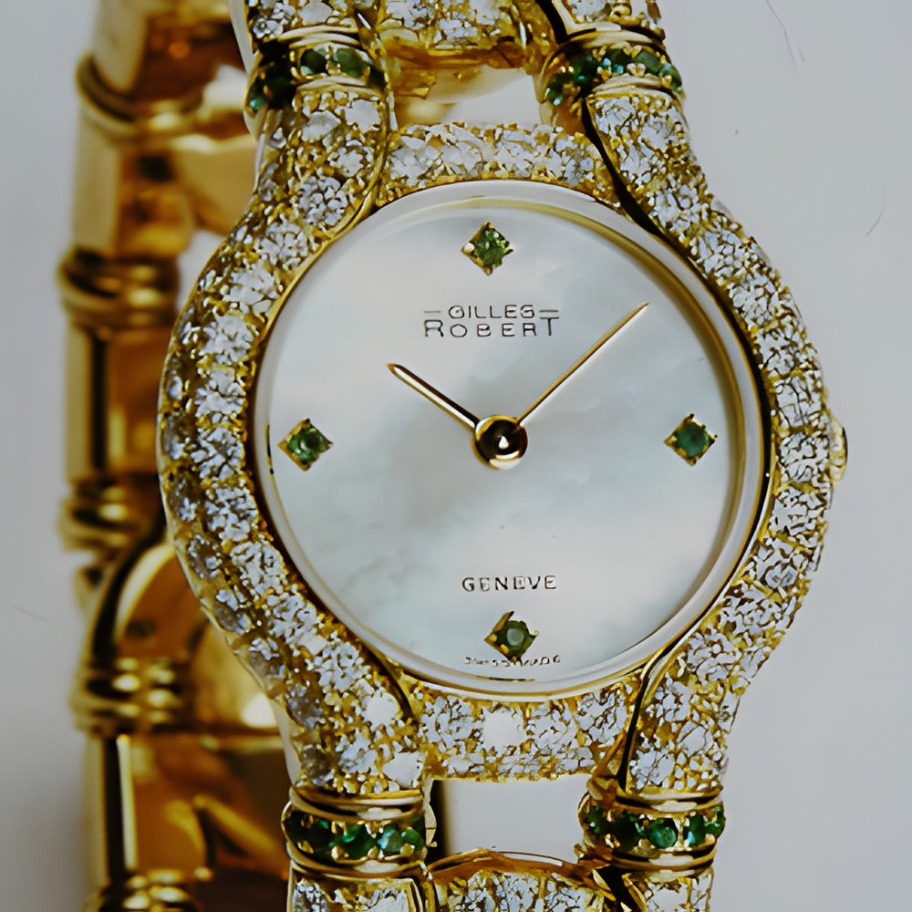 This new piece of time jewellery joining Gules Roberts gold collection features both diamonds and emeralds. It possesses a white mother-of-pearl dial enhanced with four emerald hour markers while the case houses a high-quality Swiss movement. The watch comes with a matching ring in 18K gold set with emeralds and diamonds.