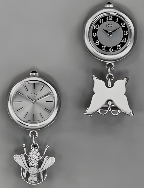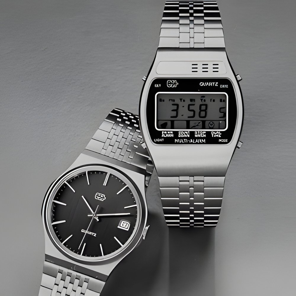 Two quartz models of the EST collection, a new brand in the category of industrial production. Left, an analogue watch with centre seconds and calendar, right a multiple function LCD model: chronograph, alarm countdown and time zones. (EST - Economic Swiss Time)