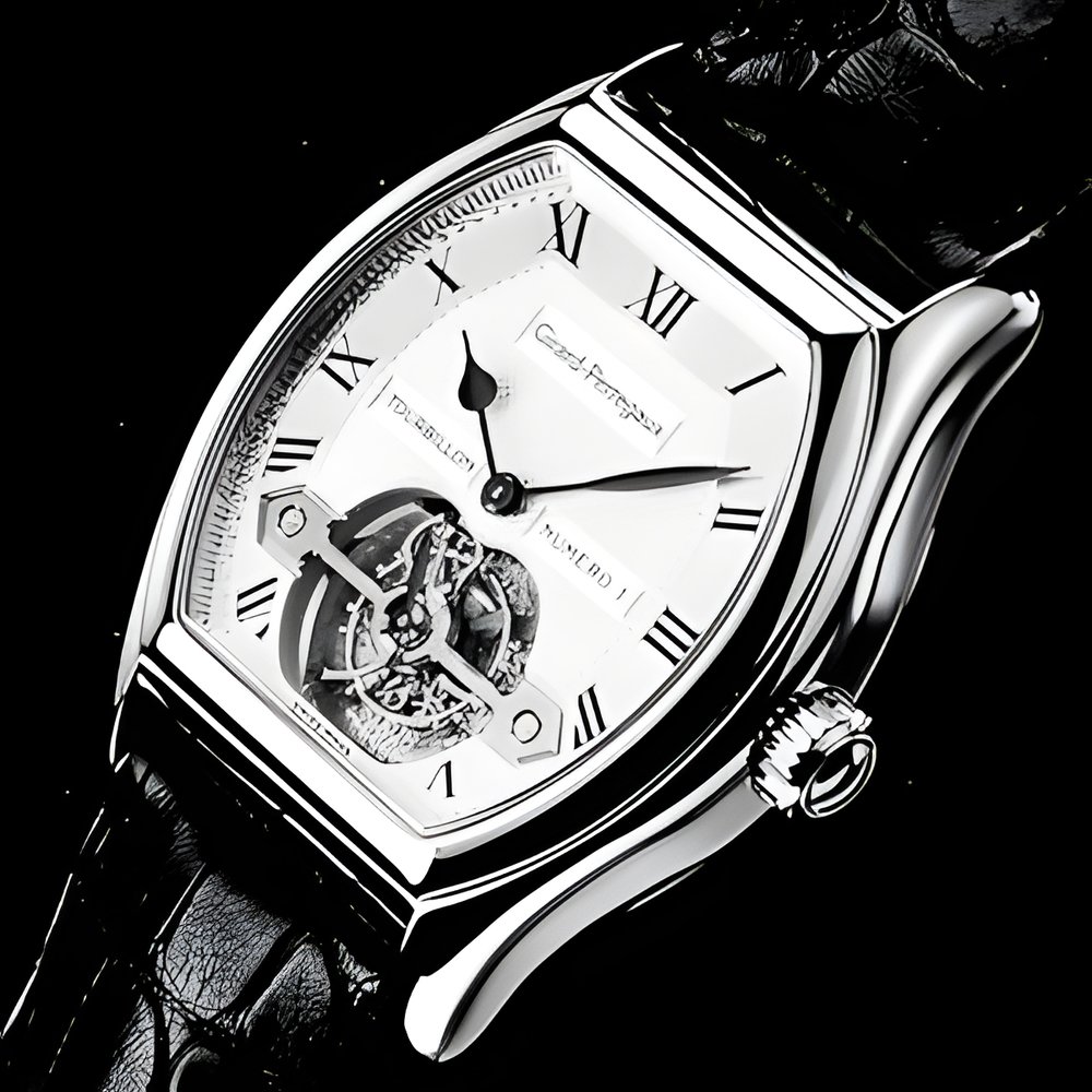 This “Tonneau” tourbillon watch from the well-known maker Girard-Perregaux features a silvered, engine-turned dial that reveals the tonneau-shaped tourbillon device under a finely shaped steel bridge, visually harmonising with the curving case sides of a timepiece made in the classic tradition.