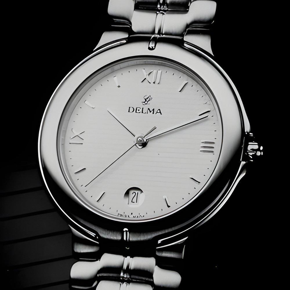 Delma’s smartly styled «Asco» design displays thoroughbred lines perfectly at ease on a man’s or a woman’s wrist. Its case connects smoothly with a two-tone, steel-and-goldplate bracelet. Water-resistant to 30 in, fitted with a scratch-resistant sapphire crystal and equipped with an ETA Swiss Quartz movement, this timepiece provides an exceptional degree of sturdiness.