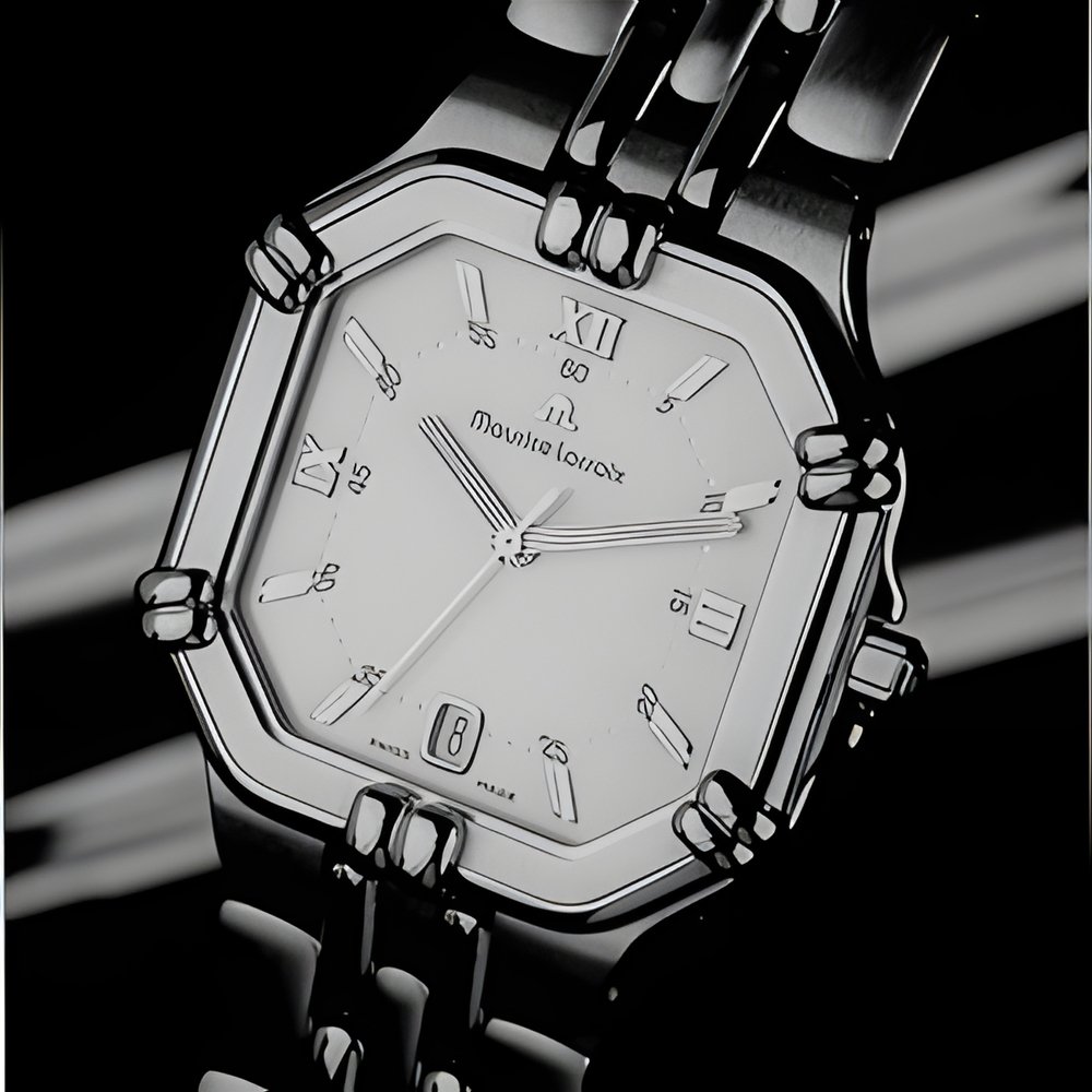 Launched at BASEL 94, this stylishly designed eight-sided creation has joined the “Calypso” collection as a handsome option for anyone looking for an exceptional timepiece. Made in two sizes, with steel, two-tone or goldplated case, it comes with a metal bracelet or a strap and offers a choice of dials ranging from polished white to brilliant mother-of-pearl. Case water-resistant to 100 m, fitted with a sapphire crystal and a screwed crown. Quartz movement with date calendar. Pictured here : a steel-cased design with 20-micron goldplated bezel and white dial with Roman numerals.