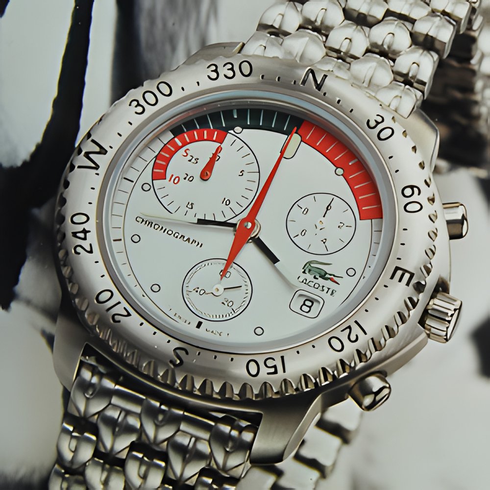 This chronograph with regatta functions is a perfect illustration of the Lacoste philosophy. ETA quartz movement; extra-large minute counter with a 10-minute zone; initialisation of minute-counter hand before use; port and starboard zones on the exterior seconds circle; green zone also used for the final i O seconds. Stainless steel case and notched bi-directional rotating bezel with 60 graduations; compass markings (3600) with north, south, east, west indicated. Genuine sharkskin strap or steel bracelet.