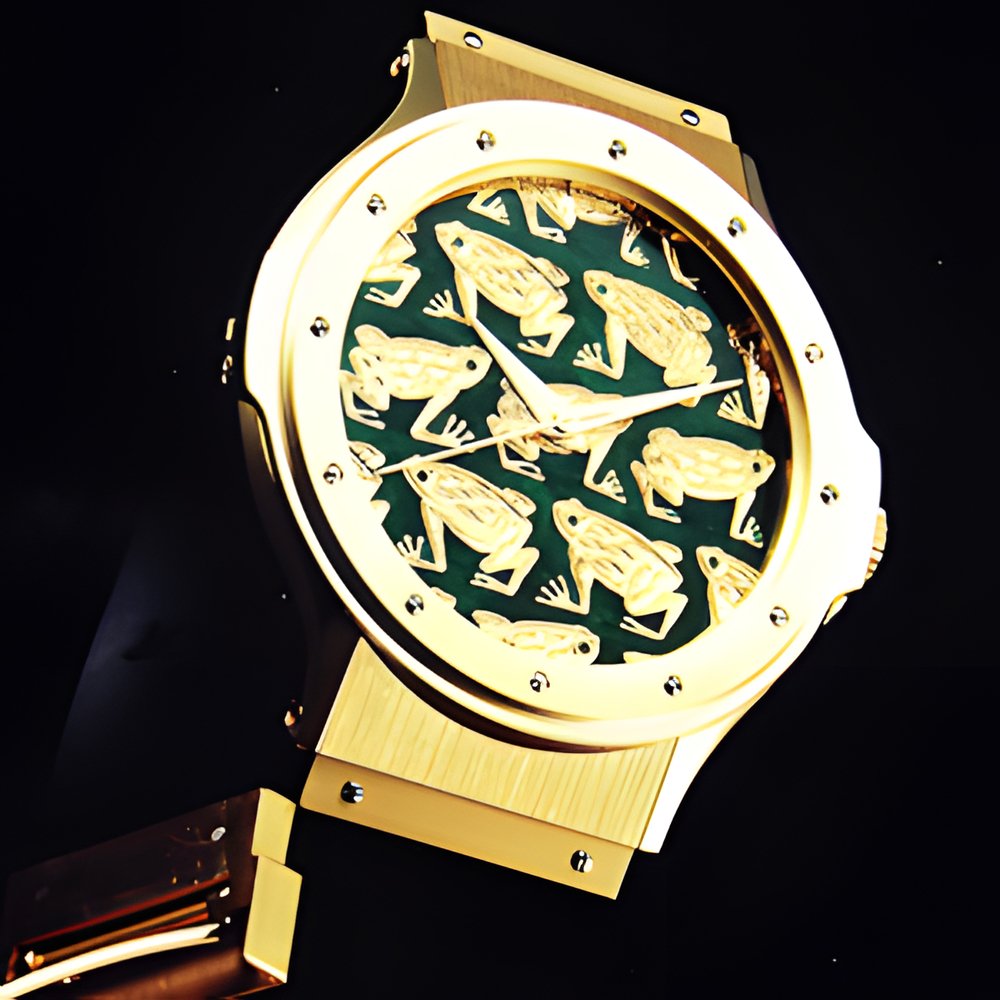 This astonishing watch features a water lily dial with enamelled frogs. The dial’s champlevé enamel design was applied with a brush on a fine gold plate. Only 60 pieces were made: 30 on a blue background, 30 on green. The gold 750 (18K) yellow gold case is fitted with an automatic movement and a sapphire crystal. Upon request, the bezel can be set with diamonds. The watch comes with a natural rubber strap or a gold 750 (18K) yellow gold bracelet.