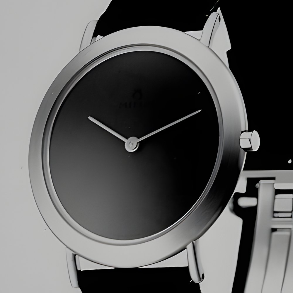 A new line in perfect harmony with the spirit of the Muus collection. The round steel case with soldered attachments holds an ISA movement, one of the world’s thinnest (3.70 mm) with a 40-month power-reserve. The satin-fmished anthracite, grey or white dial is decorated with 12 small milled beads. Available on a black bulgaro leather strap with a steel clasp, this model has a sapphire crystal and is water-resistant to 30m.