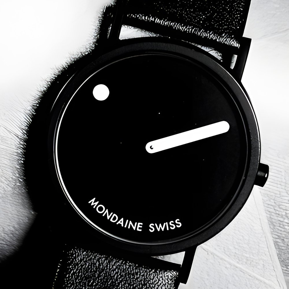 This 100% recycled metal wristwatch features a highly original dial. Exclusively conceived and manufactured for Mondaine, its system for indicating the hours and minutes was developed by two Danish designers, Erling Andersen and Steen Georg Christensen. A dot marks the passing hours and a dash the minutes in this unique creation using light and shadow as a new way to measure and appreciate the passing of time.