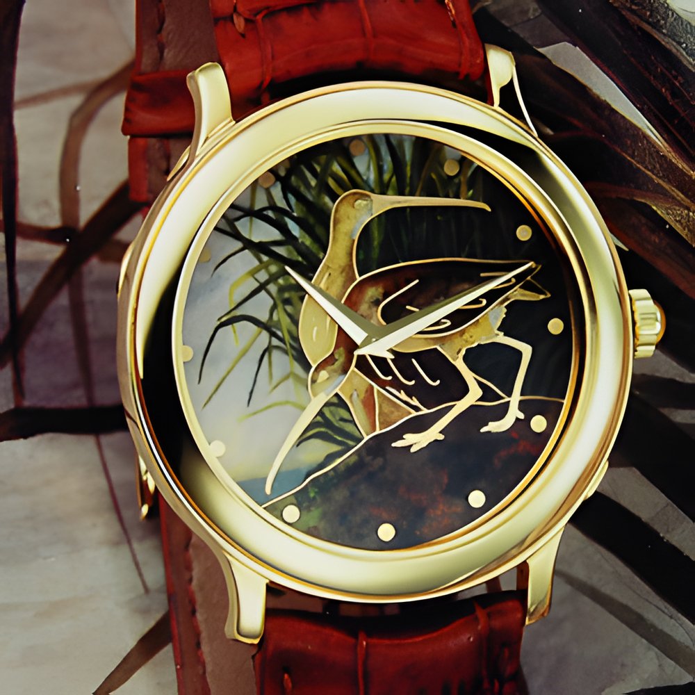 The engravings in ((Birds of America», published by the American naturalist and artist J.J. Audubon (1785-185 1) last century, have provided Vacheron Constantin with the theme for a series of exceptional men’s watches. Each dial features a bird from the artist’s book reproduced in champlevé enamel by the talented Geneva enameller, Muriel Séchaud. There are ten different birds, each in a limited edition of ten. Adorned with gold hour markers, the enamelled dials are set in a 750 (18K) yellow gold case with a cover activated by a secret spring.