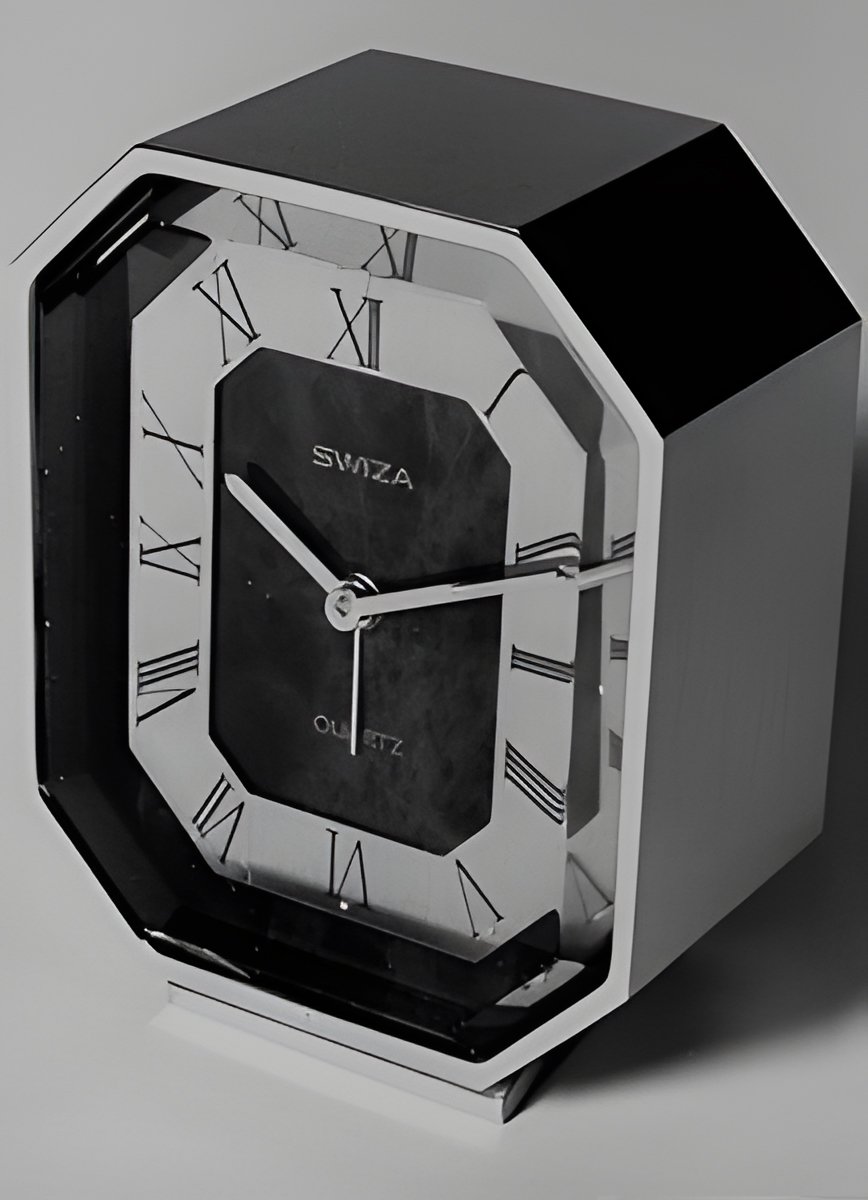This alarm clock contains a very high frequency quartz movement vibrating at 4.19 MHz (4,190,000 times a second) and its precision is accordingly remarkable Brass case, tortoise-shell type dial (SWIZA, Shanghai Collection)