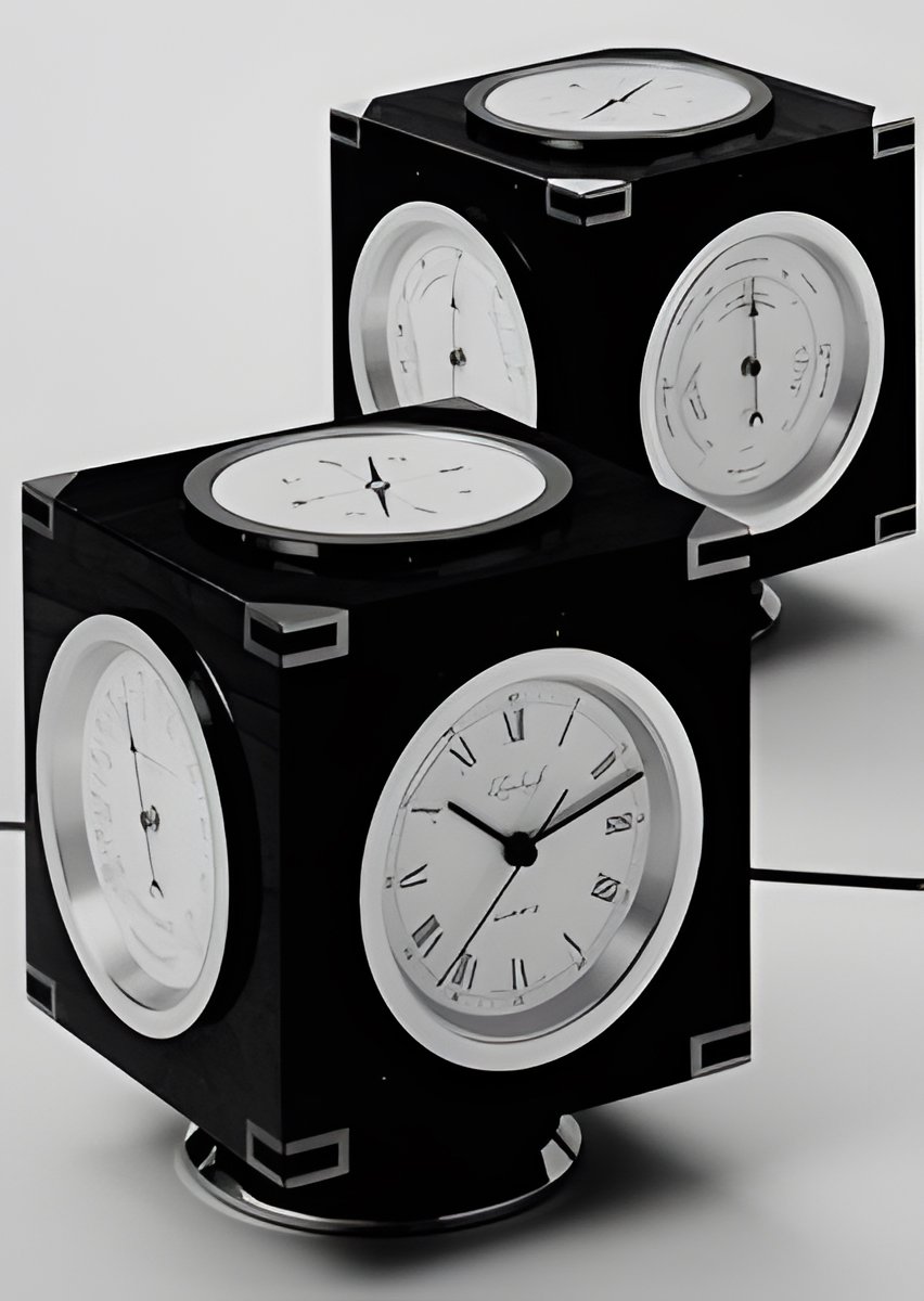 A most prestigious new item : this pivoting 5-instrument table station features an aneroid barometer, a thermometer, a hygrometer, a compass and of course a high performance quartz clock (with official rating certificate). The case is polished mahogany with brass corner insets. (IMHOF “Navymeteo”)