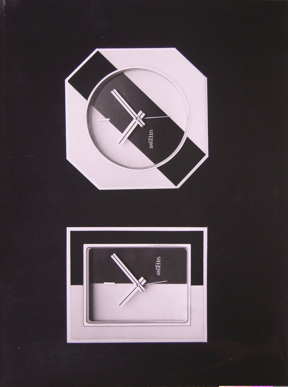 Two alarm clocks with contemporary yet classic styling from the new Angelus collection. Case in polished gilt brass, black and ivory lacquer decor. Very slim case (can therefore double as travel alarm) containing a shock-protected 8-day movement. (ANGELUS)