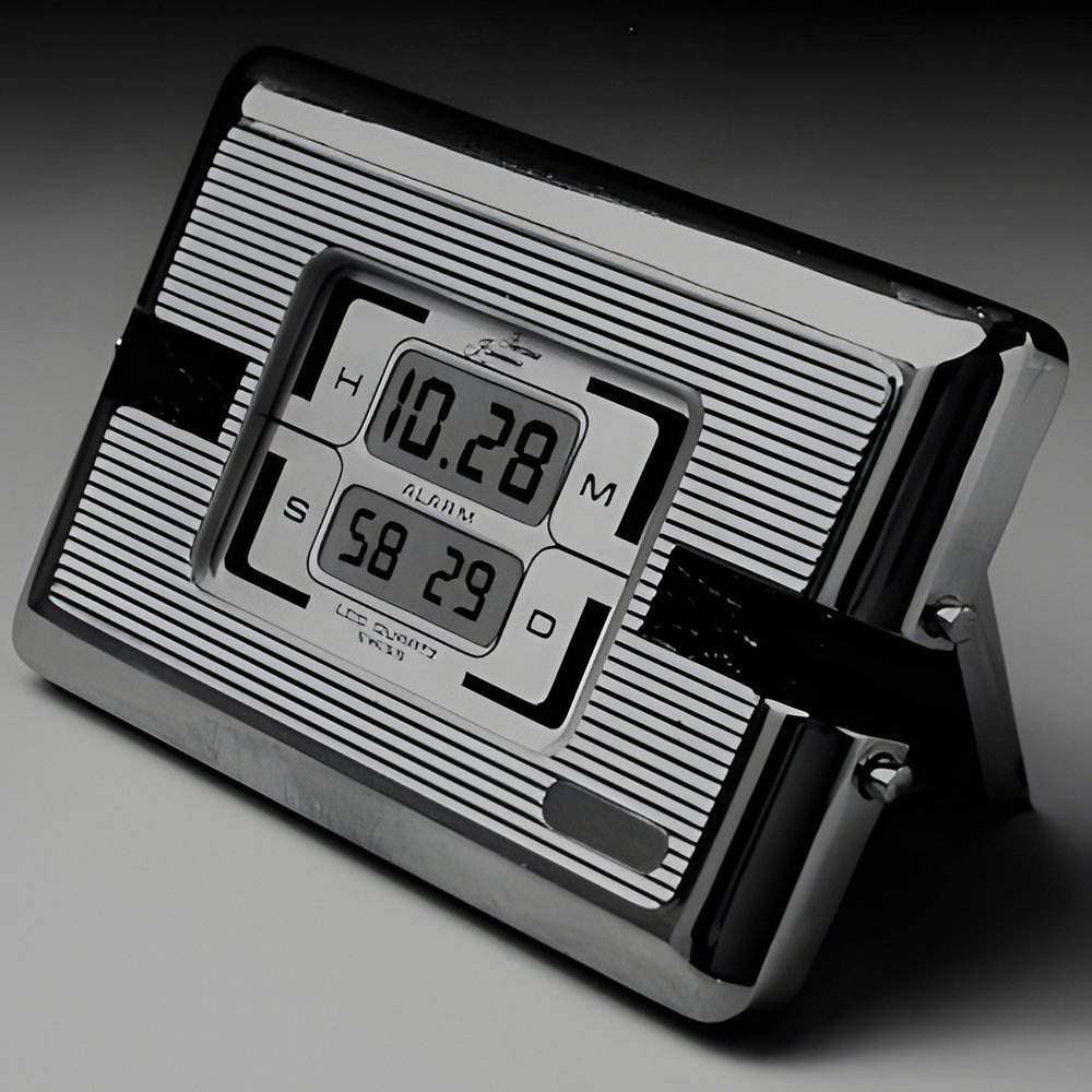 Table or travel alarm clock with 7 1/2-digit quartz-piloted LCD module. It provides a permanent readout of hours, minutes, seconds and date. Modulated buzz (45 decibels). When the alarm is set, the date readout “blinks”. Solid metal case (about 8 x 4 cm) with goidpiated or rhodium finish, leather strips and prop. Scratch-resistant mineral crystal. (JEROME RAVENNE Musical - Ebauches Electroniques, Marin)